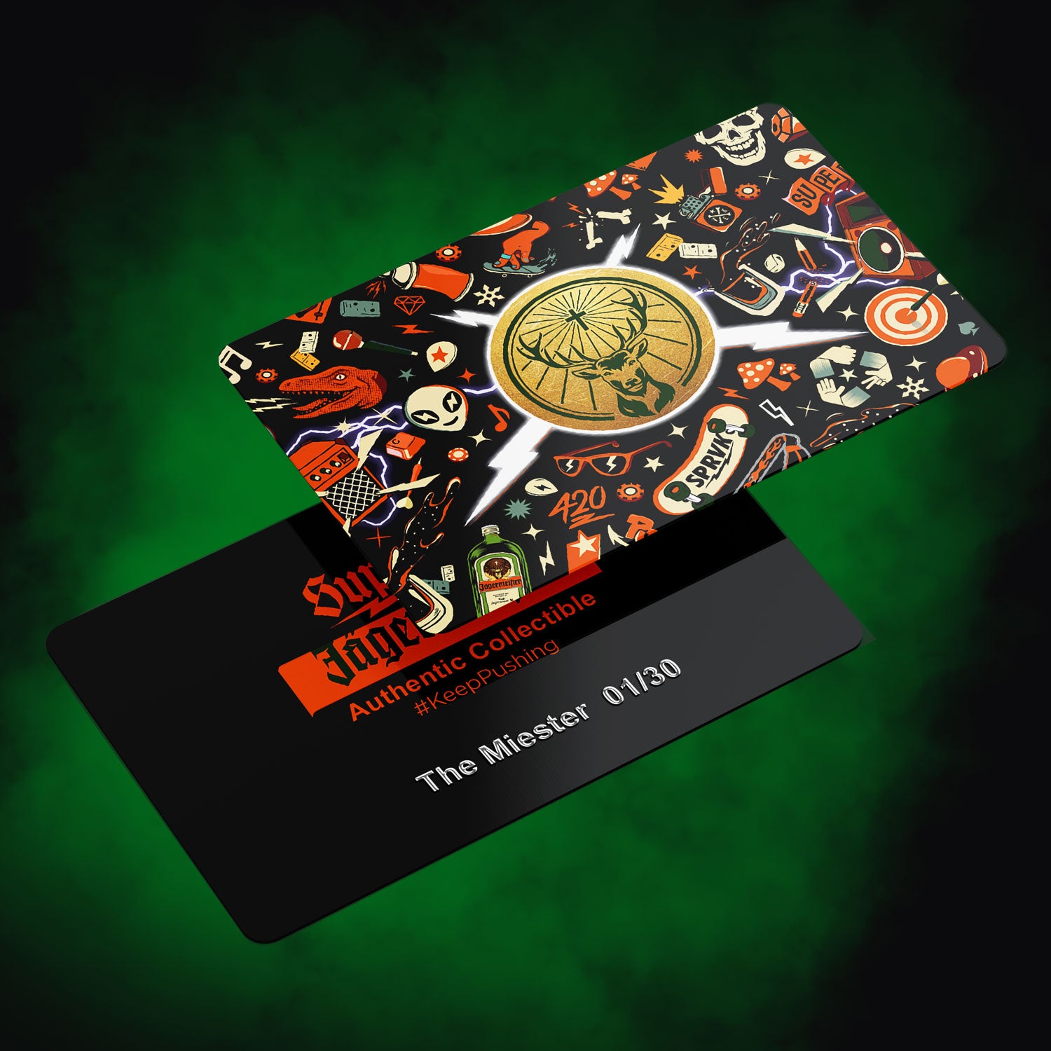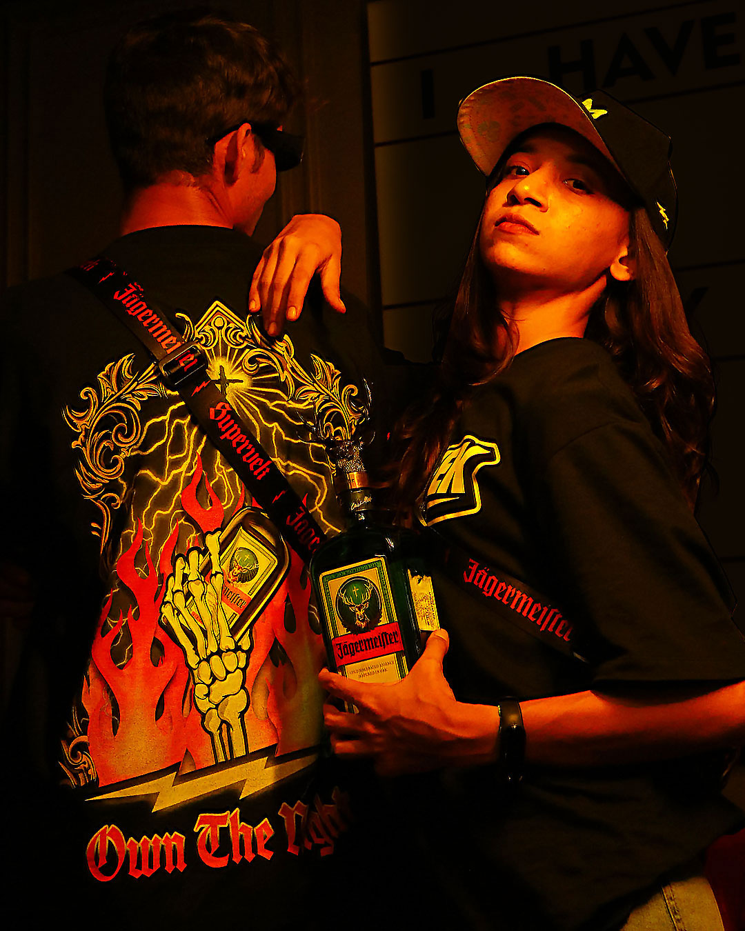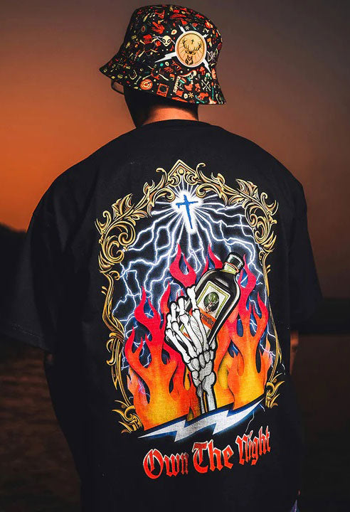 This tee showcases Supervek’s edgy energy, featuring the iconic Jagermeister bottle fronting the thunder with fire. Face the giants, stand for what you believe in and set the streets ablaze – Own the Night.